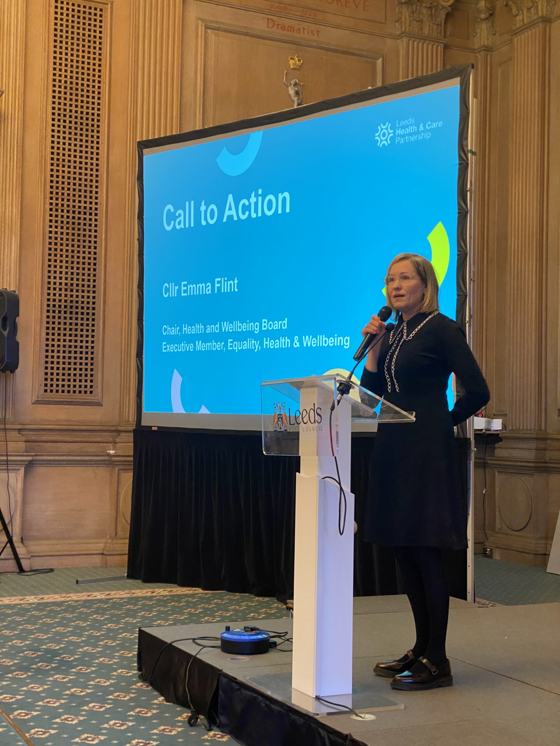 Councillor Emma Flint speaking at the Leeds NeighbourhoodHealth co-design event at Leeds Civic Hall